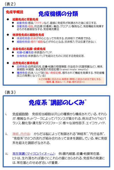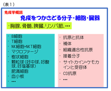 免疫系は様々な分子、細胞、組織から構成され、多様な機能を発揮している。さらに、免疫系は生体恒常性維持機構の一つとして、神経系、内分泌系と協調的に働いている。さらには、ヒトの消化管、粘膜、皮膚には常在微生物叢が構築されており、それらとの間でも相互作用している。免疫系の概略を表1,表2、表3に示した。